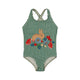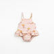 Fato de banho em lycra com estampado de riscas. Alças cruzadas nas costas com detalhe de folho.